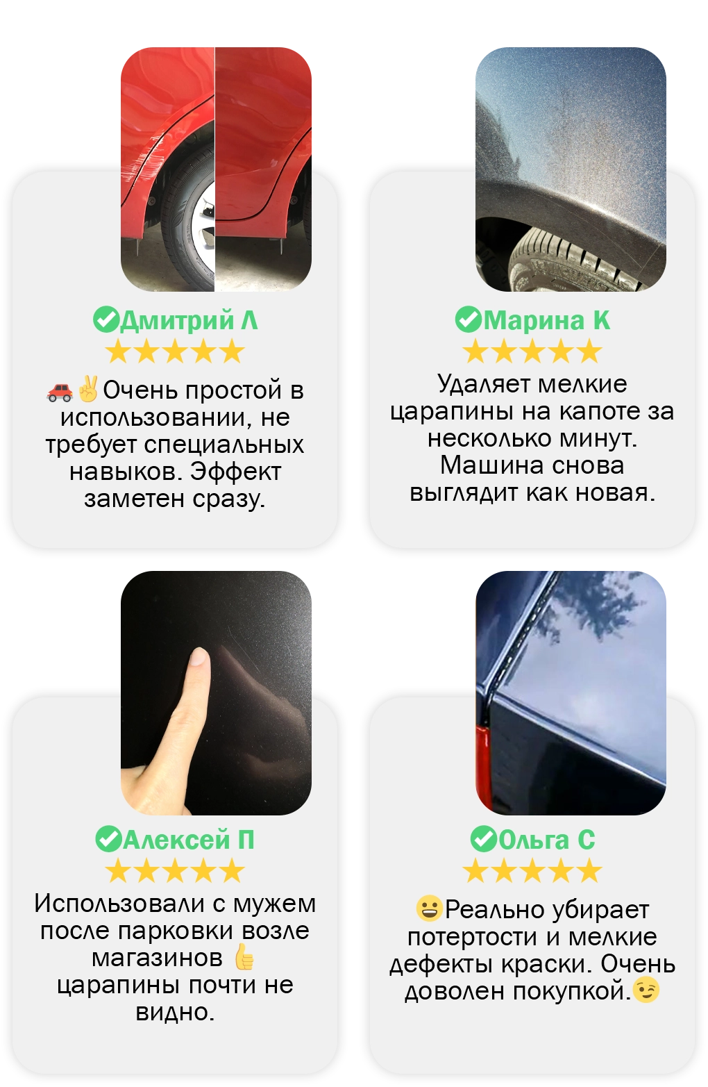 Используя нанотехнологию микроперерастворения, салфетка растворяет следы царапин и активирует цветовые пигменты краски, возвращая поверхности её первоначальный вид.
